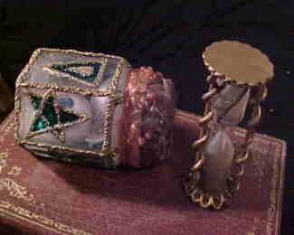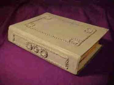 | This is actually a box that opens like a book and it is great for carrying esoteric props. The filigree is the epoxy putty all worked with nut picks, small screwdriver blades and a couple of dental picks. The use of this putty is unlimited and here it looks for all the world like tooled leather. The book below is partway through being worked on. |