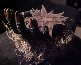 The hand was covered with a thin coat of putty and then worked for the scale effect. Nails were turned into claws and warts were added for effect. A little acrylic paint and you have a beautiful prop. The base was covered with sargassum moss for hanging baskets and can be found in any nursery. It has the same appearance of Spanish moss that hangs from the trees in the southern parts of the country. Applied with a hot glue gun, it covers the base and makes an interesting "Nest" in which the hand sits. One final step was to take a piece of chamois skin and cut a patch large enough to cover the disk, which serves as the palm of the hand. The patch was emblazoned with a symbol befitting Cthulhu and was attached with hot glue. The disk is the activating switch and the weight of a glass or a deck of cards will start the battery-operated motor and the hand goes in a straight line wherever it is pointed. |