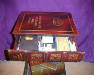Book 11. Shown vertically this stack of three opens to reveal a deep recess for hiding many things. I use this box to hide a motorized set of pulleys for drawing thread across the room by remote  control. Picture 11b shows the interior and the motor and battery in place. I use this for a version of Brother Shadow's Poltergeist routine.
