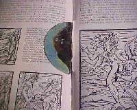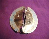 Back in the early eighties I got a copy of Tony Andruzi's "DEAMON"S DIARY," and one of the wonderful routines mater of factly described a self opening book. (page 70 in my copy of the little book) It was but a small part of a routine that used several home-made props and I had dismissed the whole, but wanted to build a self opening book. A few months ago I mentioned on the Shadow Digest about some self adhesive suede material that I found at the local Walmart. It gives texture and ambiance to that which it is applied. Relatively inexpensive, it comes in rolls and is found in the shelf covering department along with other self adhesive materials. My first step was the preparation of the opening mechanism. Using one of those decorative pop open balls I removed the multi-folded paper and exposed the plate and spring that makes the ball open, as shown below.