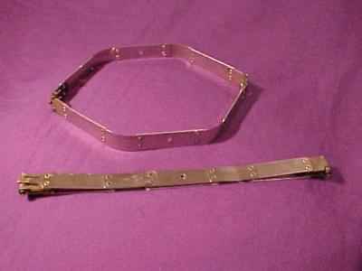 In one of the arts and craft stores I found some spring steel purse closures. These, when in the flattened state measured about eight inches long. Four strips of spring steel riveted to sturdy straps and strong spring hinges allow the contraption to open to almost a diamond shape.