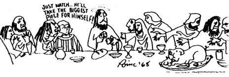 One of my favorite drawings in the spread is a cartoon depiction of DaVinci's fresco of the Last Supper. The positions of all the apostles are the same as in the original.  Jesus is standing breaking the bread.  Judas is leaning over to one of the apostles whispering, "Just watch...he'll keep the biggest piece for himself." Funny joke and that's what I was thinking at the time, but another element eventually popped into mind (thank Whomever for the subconscious that keeps working). The gag was also a commentary on Christianity, or at least the part with which I was/am familiar Catholicism, but suspect it would apply across the board. The keeping of the biggest piece for self, the formal structure of the "faith" trying to keep the biggest piece of the individual, if not the whole, for itself rather than allowing it to roam free in its search so that IF it returns there would be a Wholeness to it's integration into the faith.  Still doubts, certainly, but a free wholehearted choosing of that structure to search for meaning.  The Church works against itself.  I think one of the most horrifying sentences ever spoken was by the Pope, forget which one, who said, "Give me a child until he's five, and then you can have him back." What chilling implication whether in reference to a faith, a political system, anything actually.