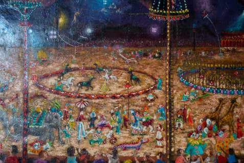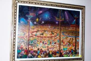 "The painting measures 36 inches by 48 inches without the frame. It has a somewhat ornate frame, but I think it really complements the painting. I love this painting so much! It was a lovely gift from my very dear friend Keith who bought the painting back in the 1970's. I have it placed in my living room, where I can view it each day. It it truly a delight. It is a painting of full enjoyment and expresses a full array of fun and excitement. I would like to know about this painting if anyone can tell me." Thank you Joel for sharing this with us. |